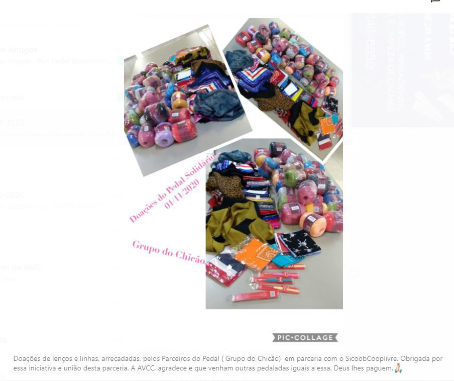 Doações de lenços e linhas, arrecadadas, pelos Parceiros do Pedal ( Grupo do Chicão) em parceria com o SicoobCooplivre. Obrigada por essa iniciativa e união desta parceria. A AVCC, agradece e que venham outras pedaladas iguais a essa. Deus lhes paguem.🙏🏻